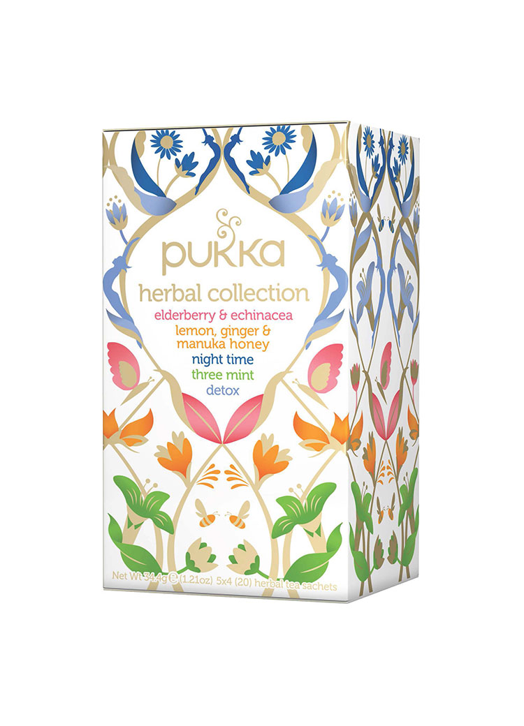 Your soul will sing. Welcome to a collection of organic Pukka flavours, made to stir your soul. Enjoy the thick fruity warmth of Elderberry & Echinacea; the spicy-sweet heat of Lemon, Ginger & Manuka Honey; the sleepy crush of Night Time; the crisp cool of Three Mint; and the clean sweetness of Feel New. Your box of herbal delight. Sing, dance, love, live.