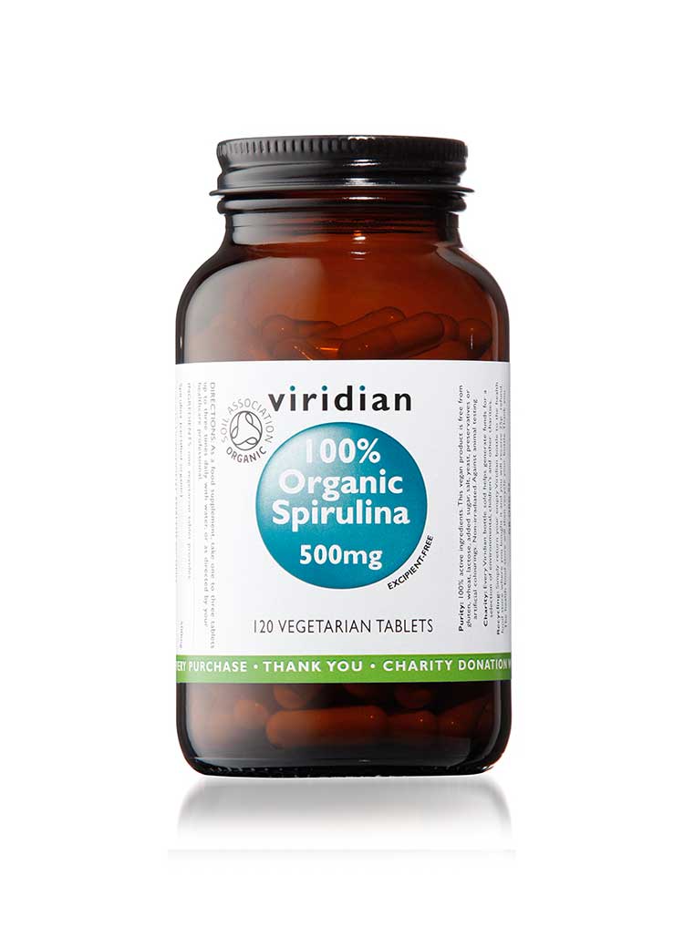 Spirulina (Arthrospira platensis) is a simple, one celled form of algae that thrives in warm, alkaline fresh-water. The name ‘Spirulina’ is derived from the Latin word for ‘helix’ or ‘spiral’, denoting the physical configuration of the organism when it forms swirling, microscopic strands. Spirulina is 69 percent complete protein, with all the essential amino acids in perfect balance. In comparison beef is only 22 percent protein. Spirulina also provides high concentrations of many other nutrients – amino acids, chelated minerals, pigments, rhamnose sugars (complex natural plant sugars), trace elements, enzymes (SOD) and essential fatty acids (both linoleic and linolenic acid) – that are all in an easily assimilable form. Spirulina is one of the blue-green algae due to the presence of both chlorophyll (green) and phycocyanin (blue) pigments in its cellular structure. Spirulina lacks cellulose cell walls, unlike other blue/green algae, therefore it can be easily digested. Viridian’s Spirulina is certified organic by the following organisations: Soil Association, ECOcert, Naturland, USDA NOP and IFOAM. Also available in a loose powder.